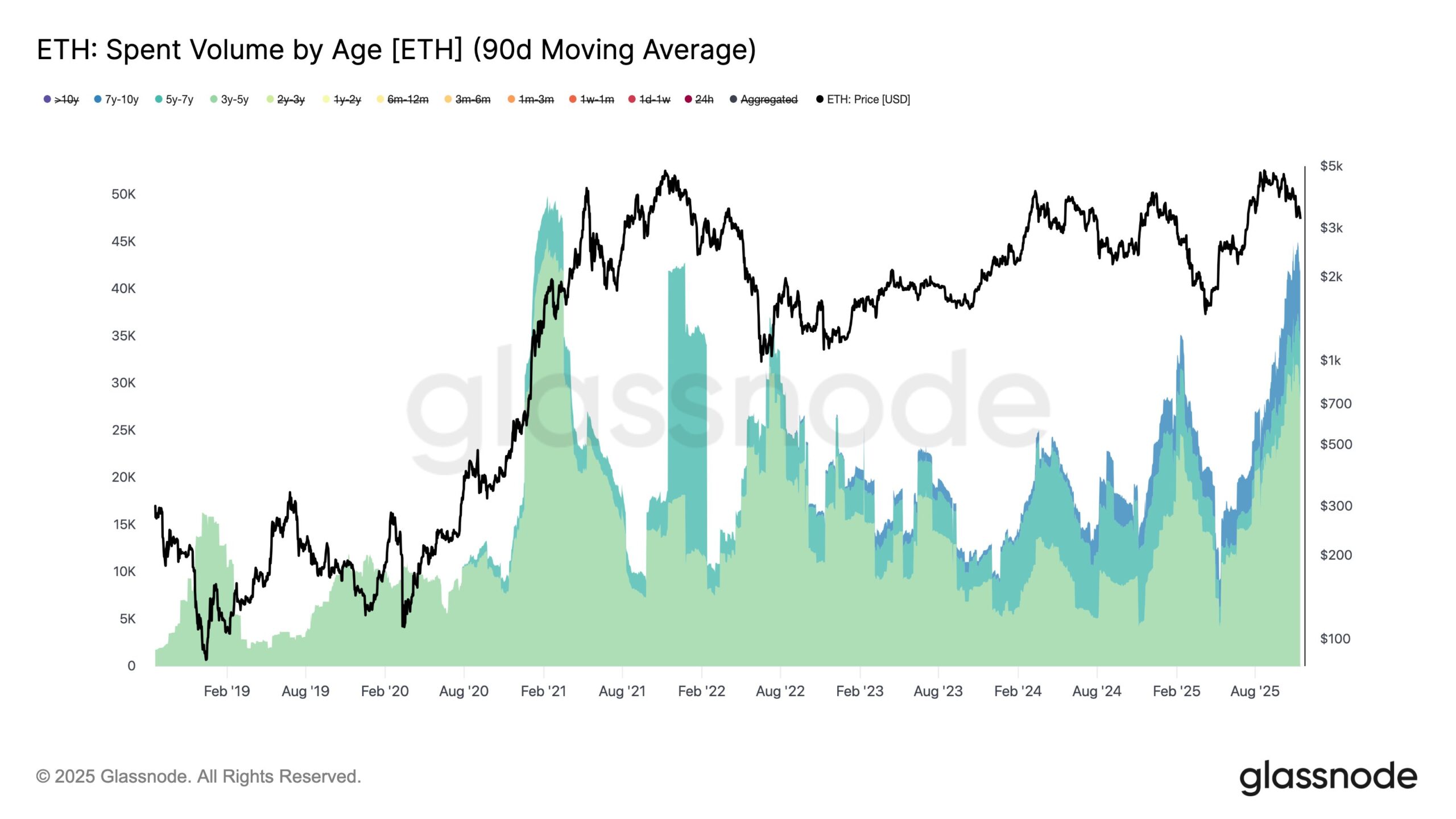 Według najnowszych danych Glassnode, od końca sierpnia obserwujemy wyraźną aktywizację tzw. „dojrzałych” inwestorów Ethereum — czyli posiadaczy trzymających swoje monety od 3 do 10 lat.