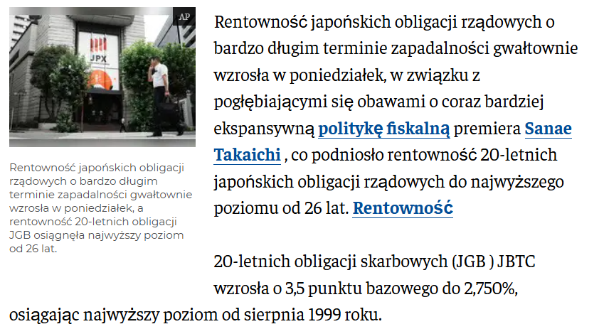 – Rentowność 20-letnich japońskich obligacji państwowych („JGB 20Y”) osiągnęła poziom około 2,75%, co stanowi najwyższy poziom od kilkudziesięciu lat.