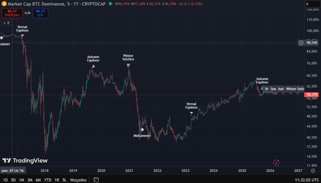- Szczyt przed upadkiem: Bitcoin zazwyczaj pompuje swoją dominację aż do granic wytrzymałości właśnie w okolicach jesiennej równonocy (Autumn Equinox).
