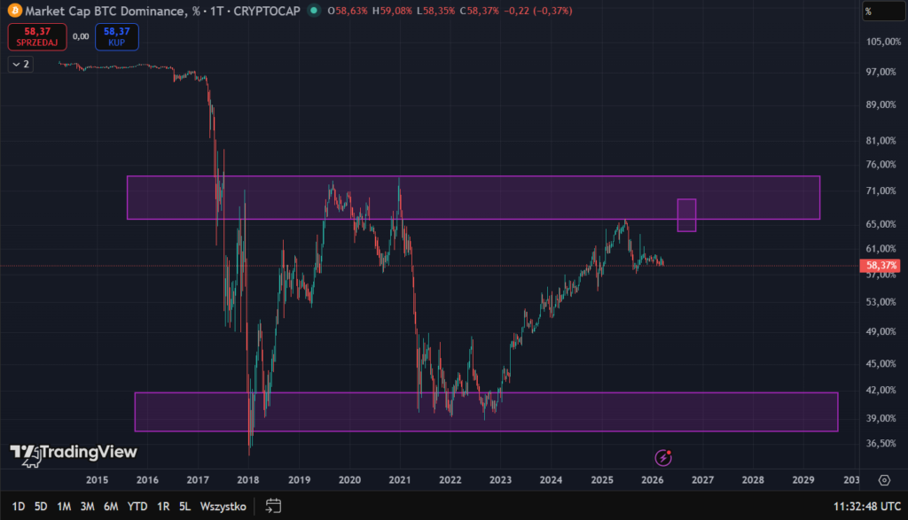 - Lokalna siła Bitcoina (Teraz – 2026): Dominacja utrzymuje się powyżej wsparcia 58%. Przed właściwym spadkiem spodziewany jest jeszcze jeden, ostatni impuls wzrostowy.