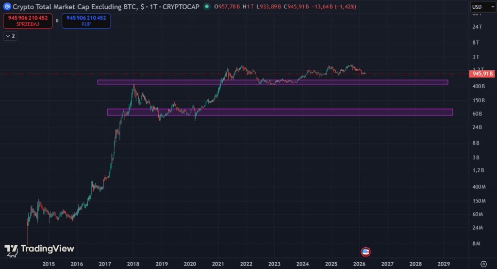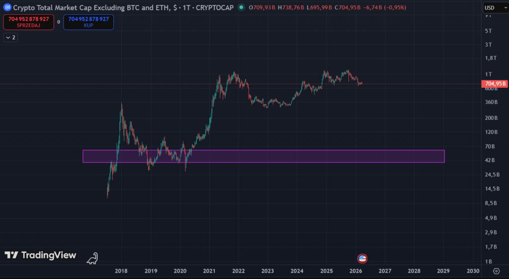Ten wykres idzie o krok dalej i wyklucza zarówno Bitcoina, jak i Ethereum. To najlepszy wskaźnik dla mniejszych projektów („small capów”). Tutaj również wyznaczyłem fioletową strefę zakupową w przedziale 42-70 mld USD, która historycznie stanowiła solidną bazę przed dużymi wzrostami.