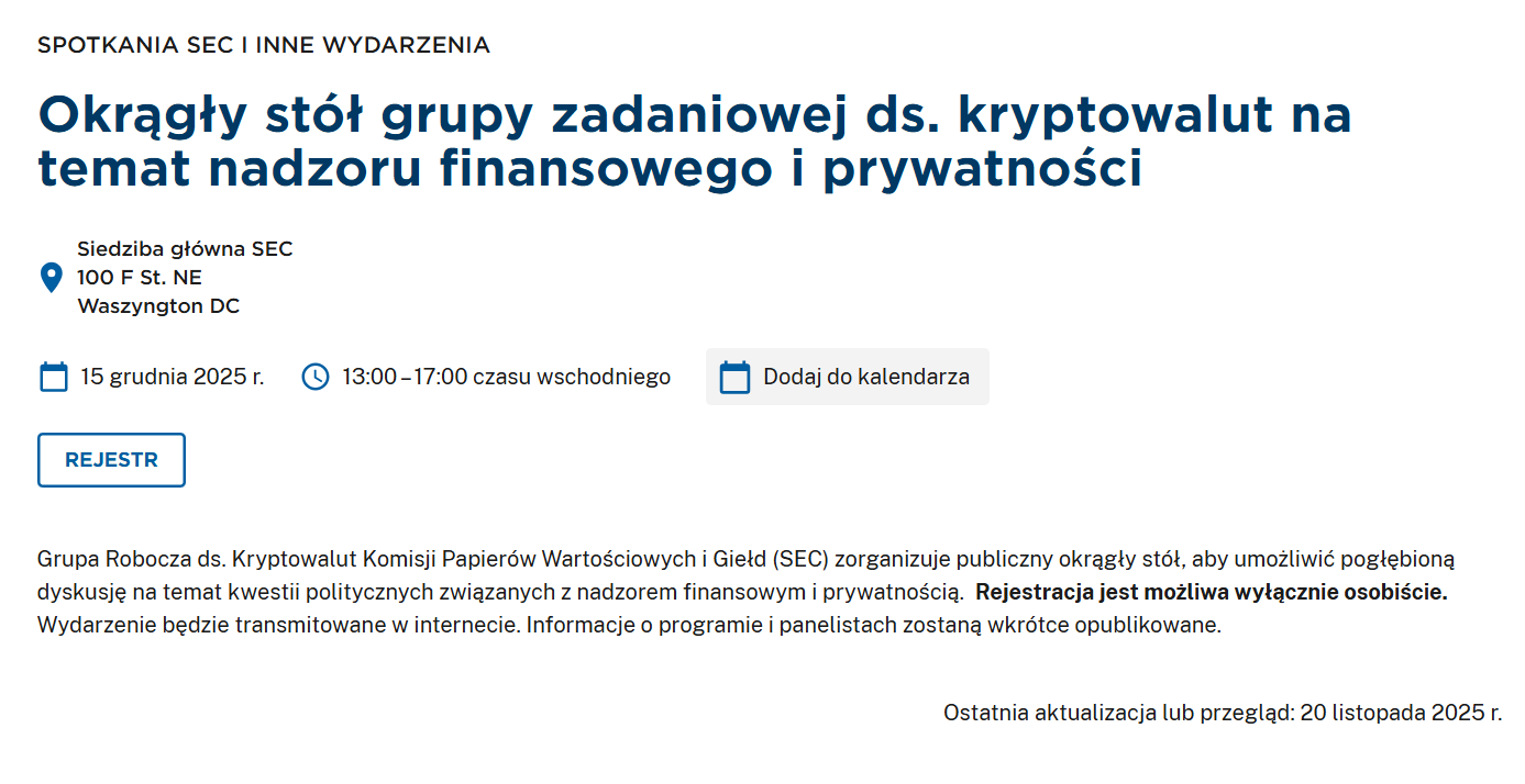 Amerykańska Komisja Papierów Wartościowych i Giełd (SEC) zapowiedziała zorganizowanie 15 grudnia pierwszego publicznego „okrągłego stołu” poświęconego prywatności, poufności danych oraz nadzorowi finansowemu w kryptosektorze. Wydarzenie odbędzie się w ramach działań Crypto Task Force.
