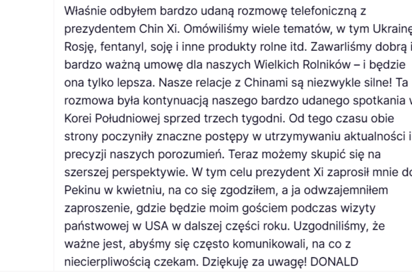 Prezydent Stanów Zjednoczonych Donald Trump poinformował, że odbył „bardzo produktywną” rozmowę telefoniczną z przewodniczącym Chińskiej Republiki Ludowej Xi Jinpingiem. Przywódcy omówili kluczowe kwestie międzynarodowe — w tym sytuację na linii Ukraina–Rosja, problem fentanylu oraz handel soją i innymi produktami rolnymi.