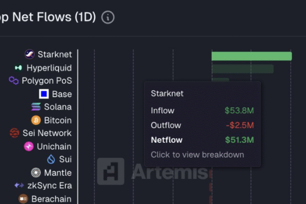 Według opublikowanej niedawno informacji przez Eli Ben‑Sasson, CEO firmy StarkWare i współzałożyciela Zcash (#ZEC), Starknet konsekwentnie zajmuje czołowe miejsce pod względem napływu kapitału spośród wszystkich blockchainów.