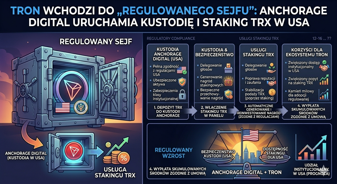 Amerykańska firma Anchorage Digital, posiadająca prestiżową licencję bankową od OCC (Office of the Comptroller of the Currency), oficjalnie włączyła sieć TRON do swojej oferty. Oznacza to, że po raz pierwszy instytucje z USA mogą przechowywać i stakować TRX w ramach w pełni zgodnej z prawem, federalnej infrastruktury.